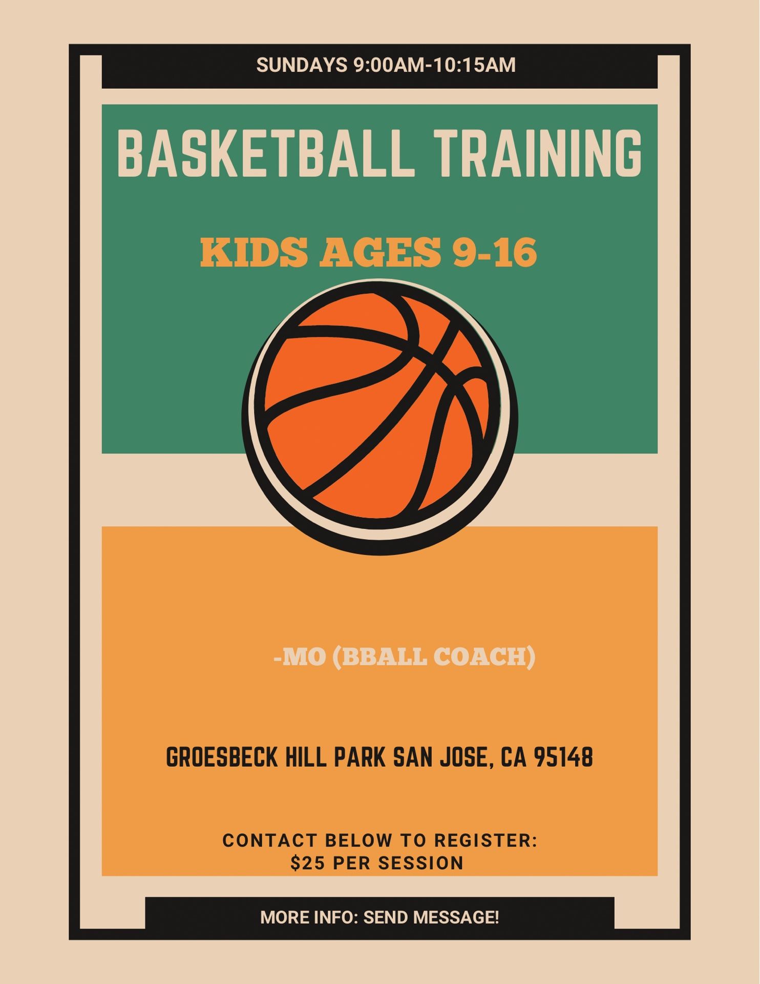 Kids basketball training every Sunday morning from 9:00am-10:15am We have two locations one in San Jose ( Norwood Ave & Klein Rd, 2735 Klein Rd, San Jose, CA 95148 ) and one in Santa Clara ( 2250 Royal Dr, Santa Clara, CA 95050) Come improve your basketball skills and have fun!