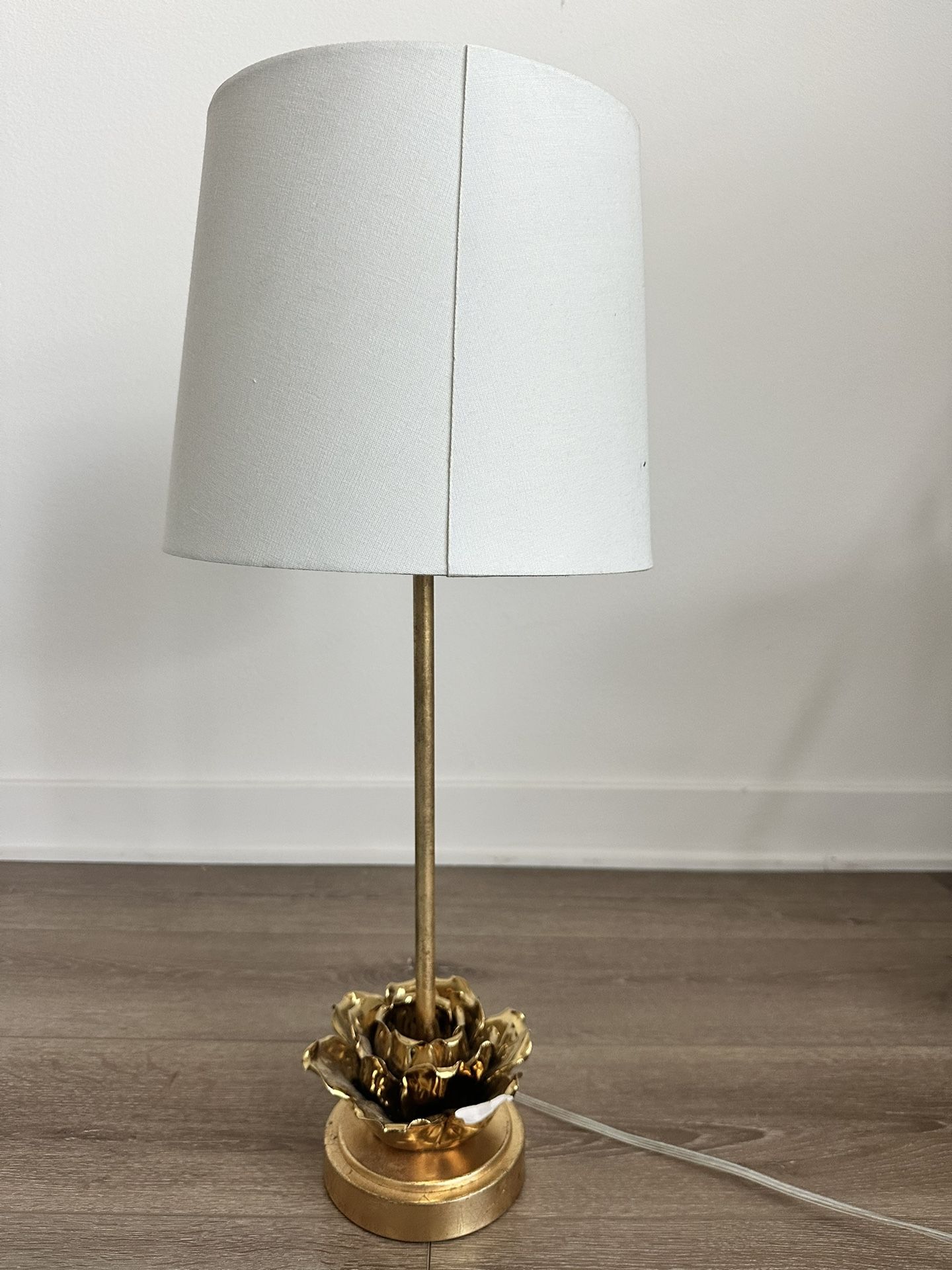 Table lamp with gold flower base. Has small chip.