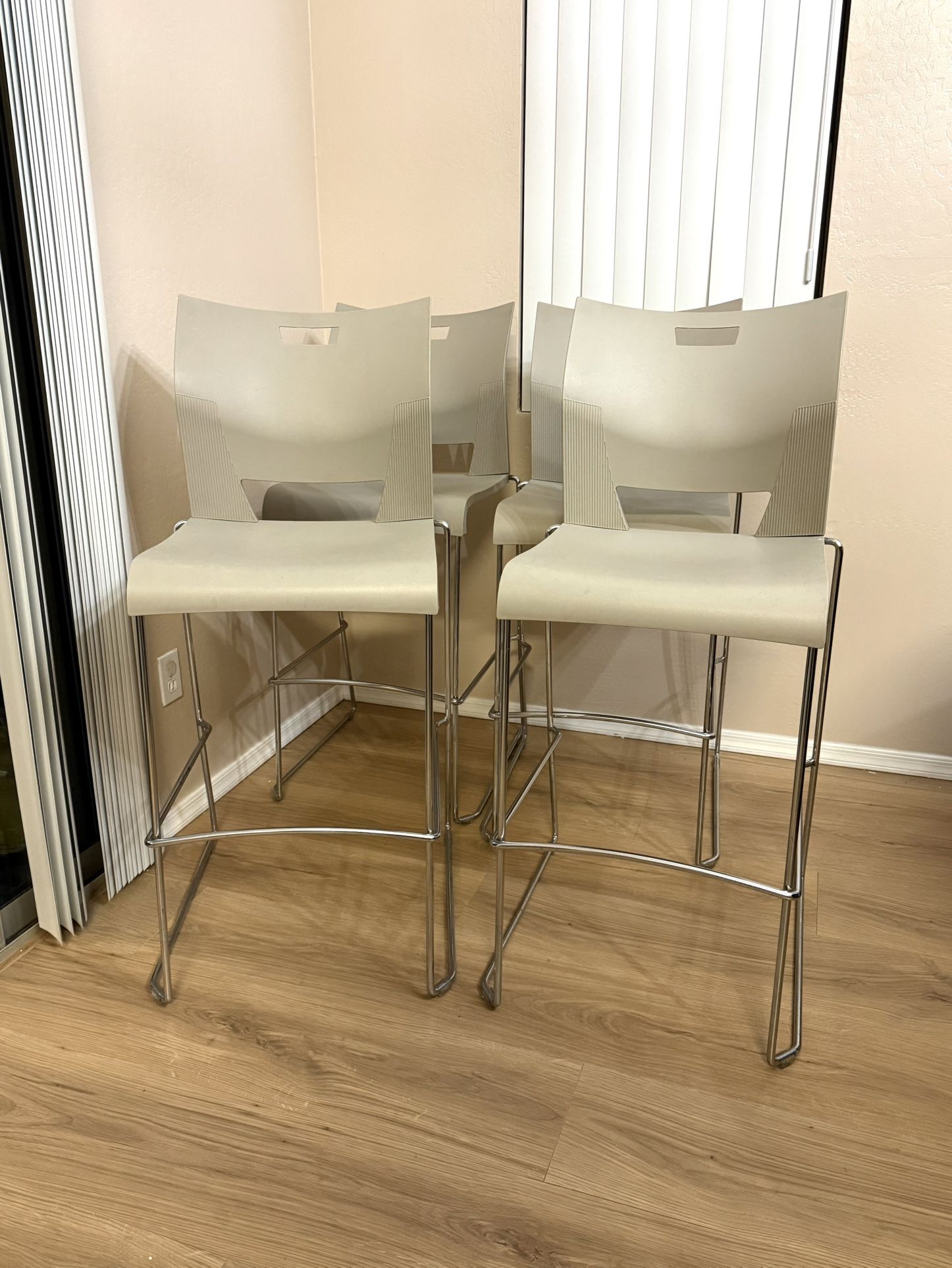 Set of 4 Light Grey Barstools. Preowned, but in great condition! Minor scuffs and wear (pictured). Seat and back is plastic but very heavy duty and high quality. Seat Height: 29.5”’ Seat Width: 18” BE SURE TO FOLLOW MY PAGE AND CHECK OUT MY OTHER DEALS! I’VE GOT TONS OF AWESOME DEALS ON FURNITURE, TOOLS, HOME DECOR, AND MORE WITH NEW DEALS BEING ADDED DAILY!