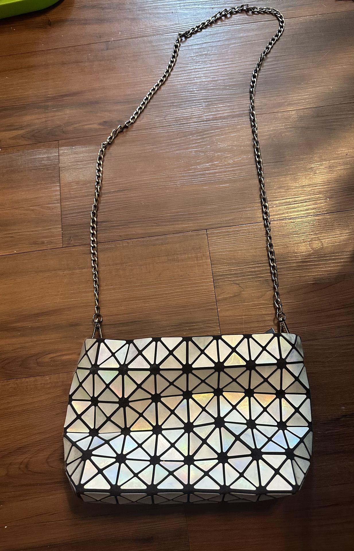 1 silver iridescent geometric purse/clutch with detachable chain. Zipper to close/open. Material is very reflective! 10” x 6”. Detachable chain is approx 40” long total (20” long when attached to purse) $8