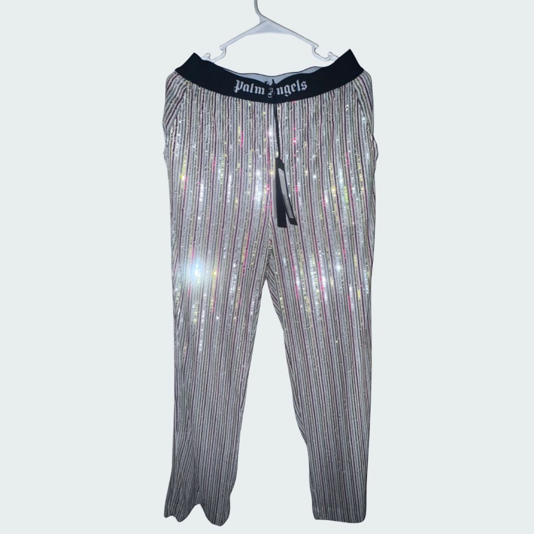 Eye-catching pants with shimmering stripes. Features a branded waistband. Brand New with tags. Palm Angels Rainbow Sequins Pajama Pants Size- Medium