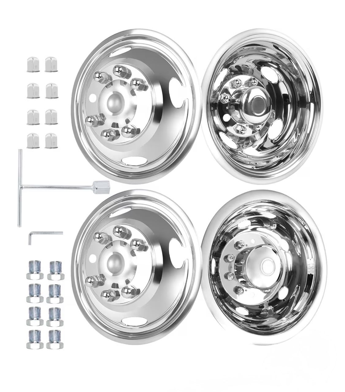 Brand new 16 Wheel Simulators, 16" 8 Lug Stainless Steel RV Hubcaps,Polished Surface,2Pcs Front Wheel/2Pcs Rear Wheel,Bolts On Wheel Cover Set Compatible with Ford 2008-2025 E-350/E450 Dual Rear Wheel