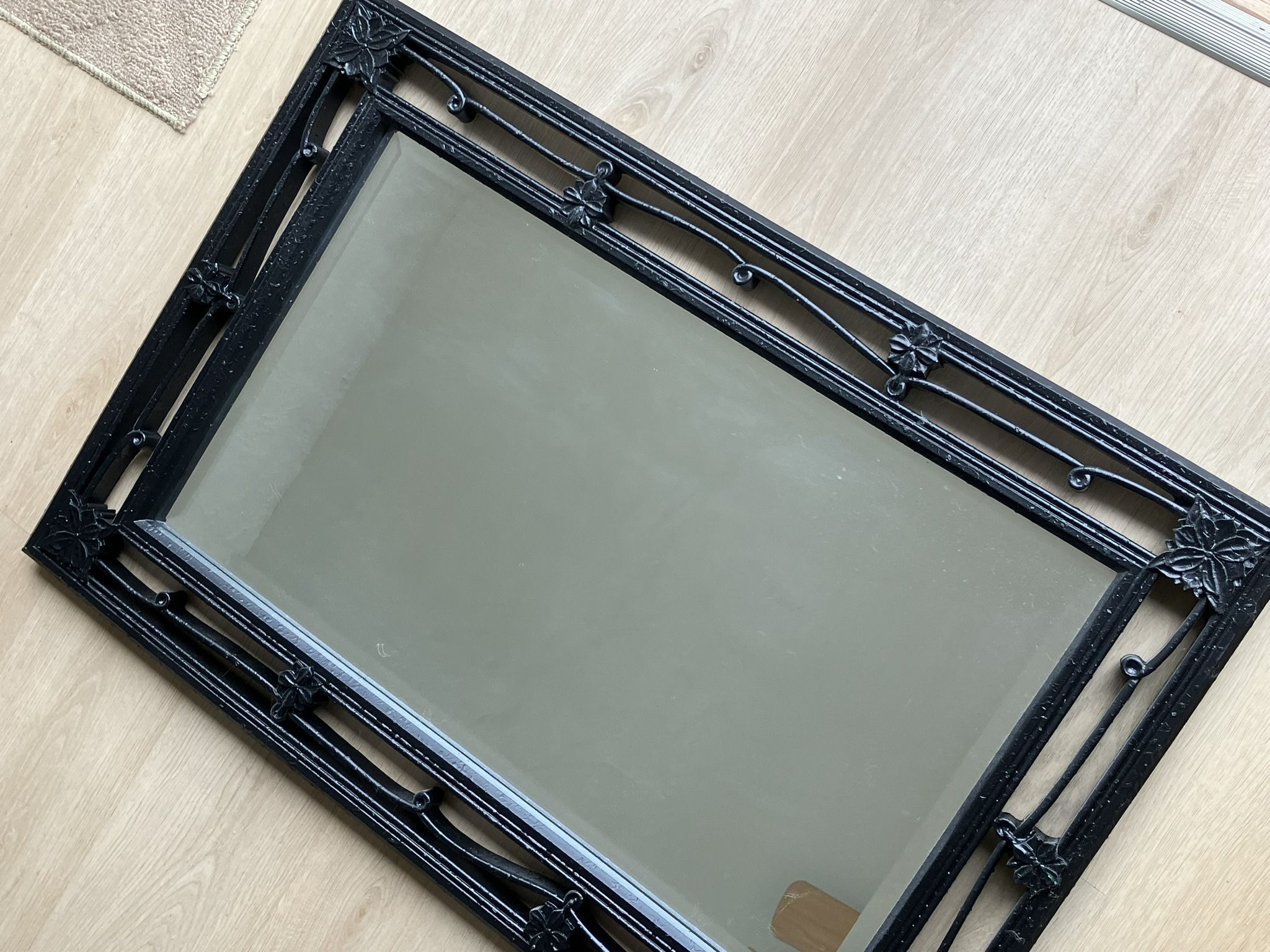 36” x 24” mirror with interesting, scroll-like, wooden black frame