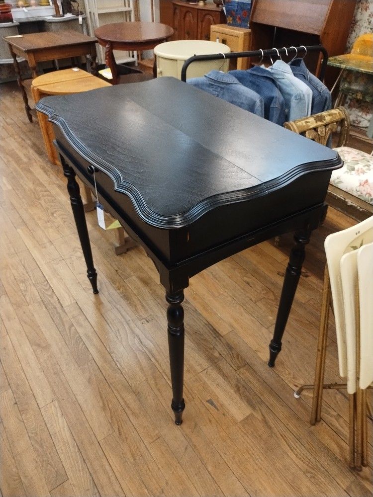 This desk has cubbies and a slide out surface. Perfect size not too big not too small. 30w18.5d34.5h Access from the back for power cords. Available at Antiques and Things booth 7. 4710 Central SE open Tues -Sat 10 to 6 Sun 12-5.