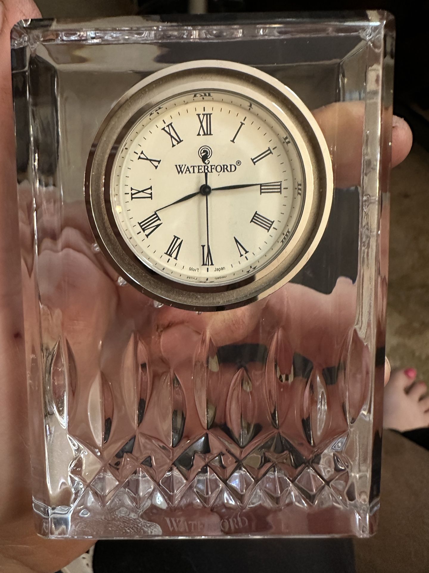 This clock is in pristine condition and is highly collectable it has battery only recently installed. This is a Waterford Ireland Crystal Lismore desk clock. Key details include: • It features the signature Lismore diamond and wedge cuts. • • The clock face has Roman numerals and a silver-tone finish. • It utilizes a quartz movement and is battery-powered. • The clock is crafted from high-quality crystal material. • It typically retails for around $150, depending on the specific size and condition.