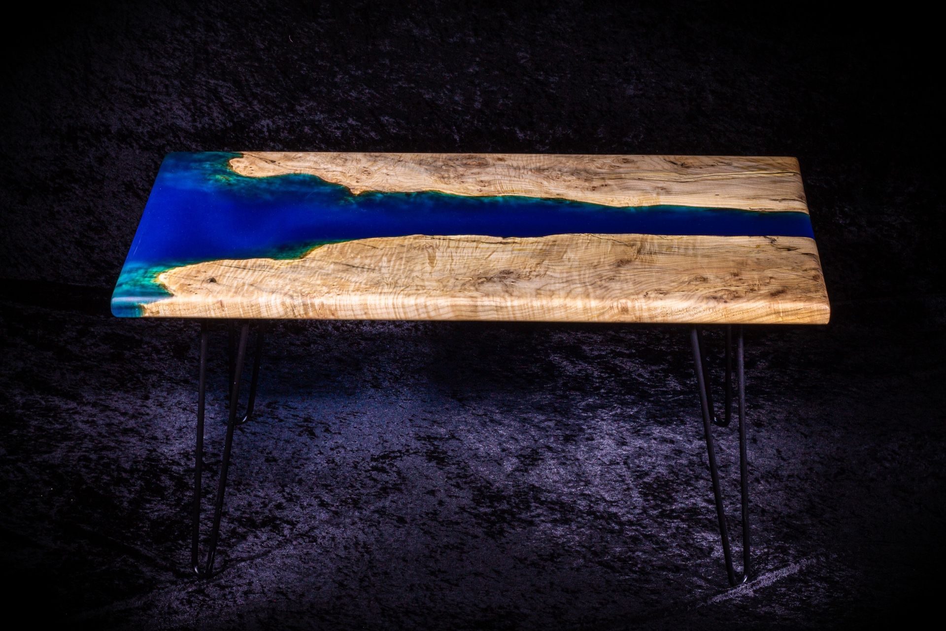 “Mouth of the River” Live edge river table made from a local tree. Material: - local maple slab - resin - 16” metal legs - flush inserts for easy assembly and reassembly Dimensions: 35L x 17.5”W x 17.5”H Custom orders available