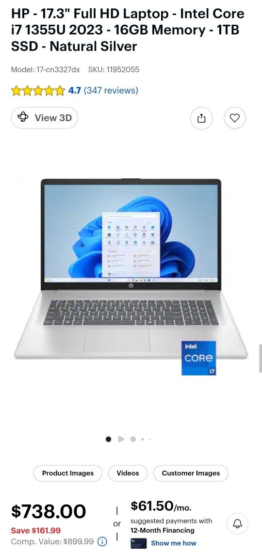 Key Specifications & Features Performance: Intel Core i7-1355U (10 cores, up to 5.0 GHz) and 16GB DDR4 RAM. Storage & Memory: 1TB PCIe NVMe M.2 SSD for fast storage and 16GB RAM. Display: 17.3-inch diagonal Full HD (1920 x 1080) IPS screen, 250 nits brightness, non-touch. Graphics: Integrated Intel Iris Xe Graphics. Battery: 3-cell, 41 Wh Li-ion battery, lasting up to 10 hours. Connectivity: 1x USB-C (5Gbps), 2x USB-A (5Gbps), 1x HDMI 1.4b, and headphone/microphone jack. Dimensions & Weight: 0.78" thin and weighs 4.60 lbs. Design & Usability Design: Natural silver color with a lift-hinge design to elevate the keyboard for comfortable typing. Features: Enlarged clickpad, HP Fast Charge, and built-in microphone. Suitability: Ideal for multitasking, streaming, and office work due to the large screen and capable processor.