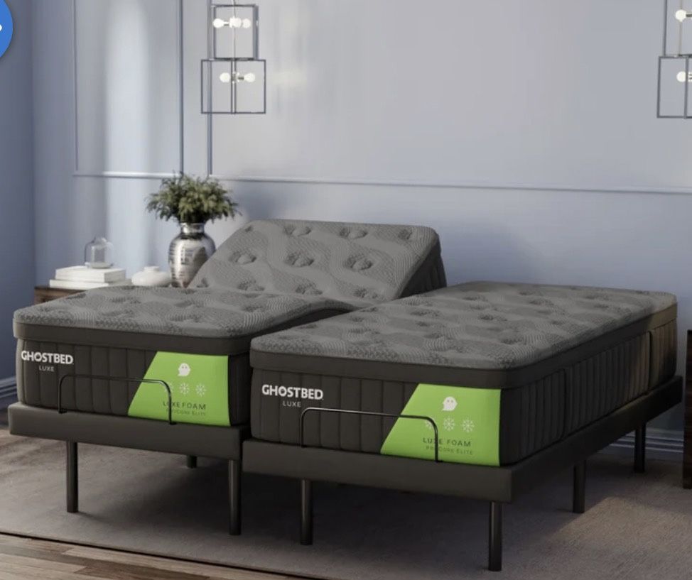 BRAND NEW IN BOX Ghostbed luxe brand split king adjustable bed includes 2 mattresses, 2 adjustable bases, and 2 remotes. Goes up and down at the head and feet. Has massage, zero gravity and anti snore. Has night lights and usb ports. Mattresses are 14 inches thick. Retails for $3500 plus tax.