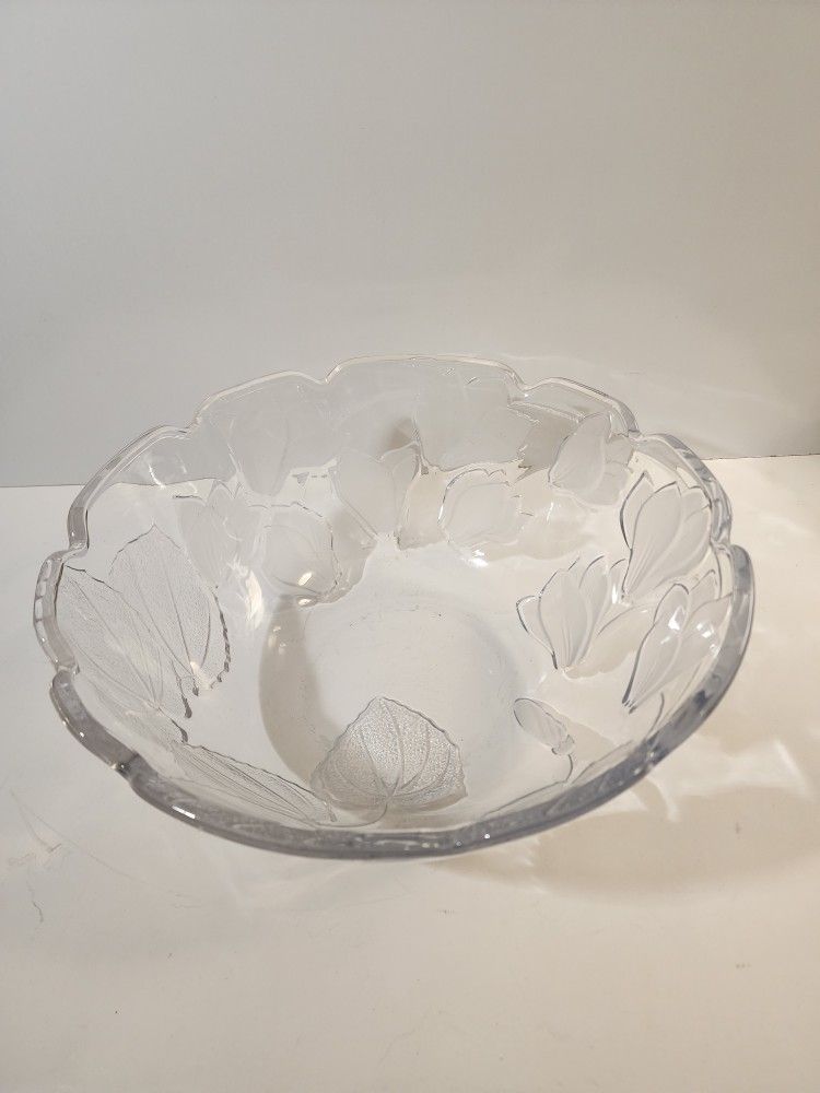 Vtg. Mikasa Clear Crystal 12.25" Salad Bowl, Leaves, Frosted Tulips, Scalloped Rim