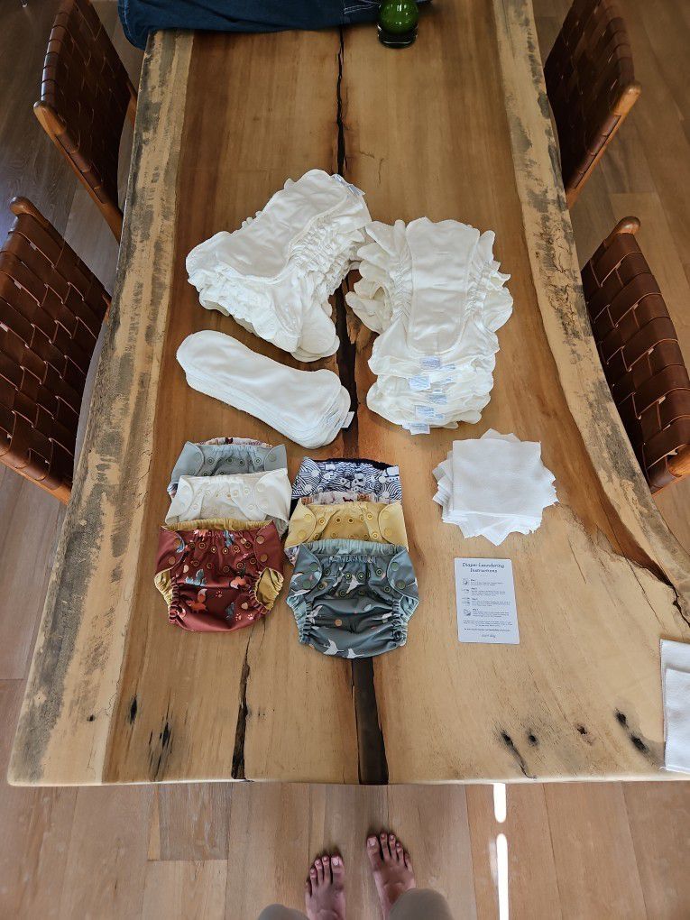 24 fitted organic cotton diapers 6 waterproof outers / swim diapers 22 moisture wickening fleece liners 8 overnight boost super soaker liners Cloth Diaper how to wash Guide magnet All have been washed 10 times for maximum absobency with Honest brand fragrance free hypoallergenic baby detergent. Most have never been used. No stains- all in excellent condition.