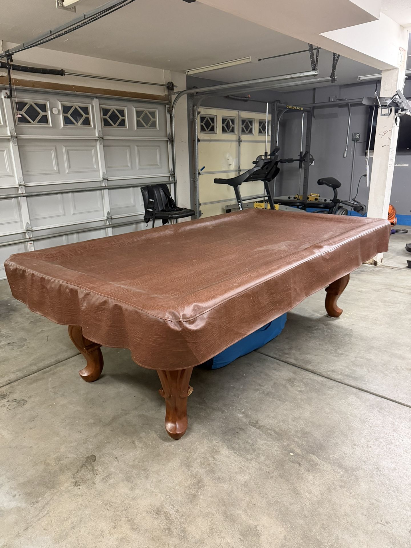 New project and need room in our garage. Here are pictures of the complete pool table set. Accessories included: pool light, wall-mounted pool cue rack and pool-themed chalkboard.