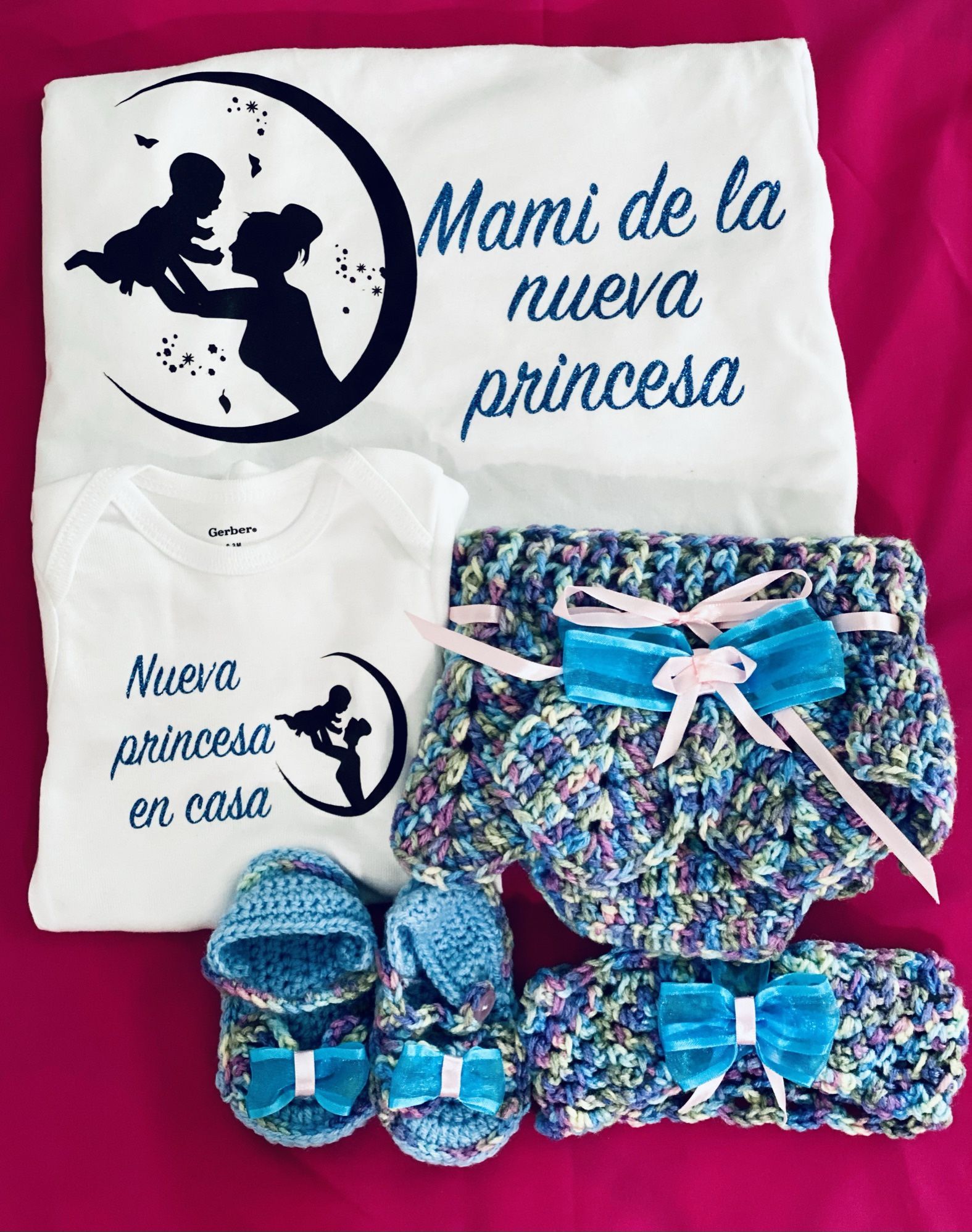 Set of personalized t-shirts for mom and baby. Set of mother size M t-shirt with Gerber baby bodysuit from 0 to 3 months, includes baby shoes, skirt cuber diapers and headband. Custom can be customized, text, size and colors. Manually carried out in a smoke-free and pet-free home.