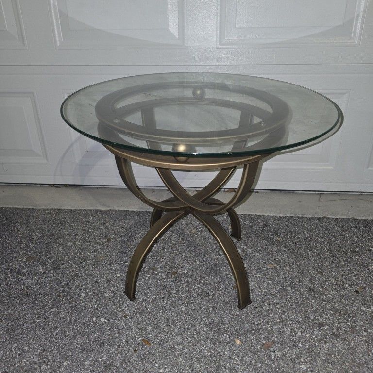 Enhance your space with this stylish glass and metal side table. Featuring a sturdy bronze-finish metal frame and a sleek tempered glass top, it’s perfect as a living room end table, bedroom nightstand, or office accent. Minimal wear; excellent condition. Dimensions: 22" height, 20" diameter
