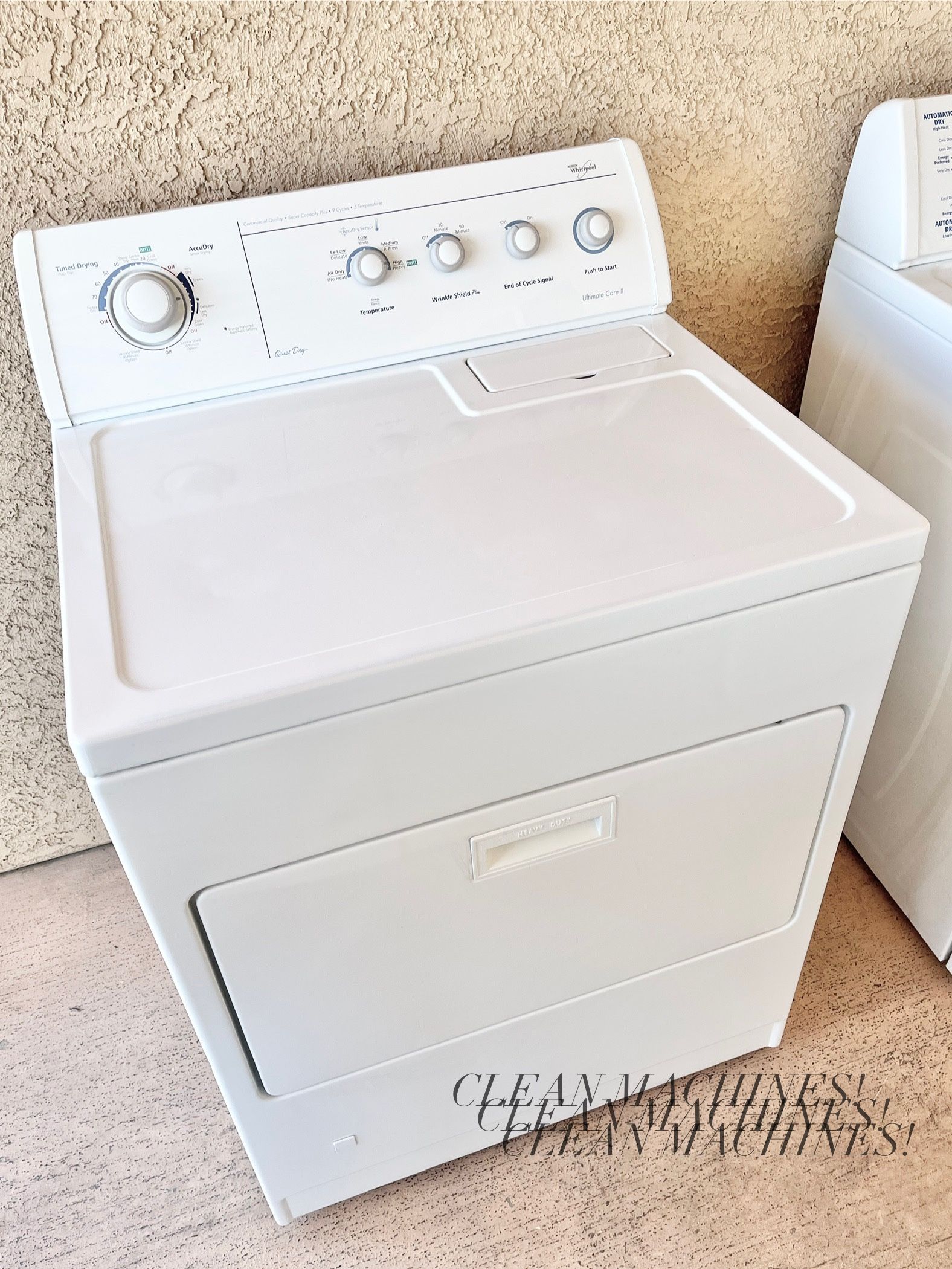 CLEAN MACHINES! Whirlpool gas dryer. Super capacity, commercial quality, wrinkle shield. Completely serviced in good condition and works great. Clean from the inside out. Brought back as close to new as possible. 90 day warranty and ask about delivery. Many dryers available. Capacity: 7.0 cubic feet Width: 29 Depth: 29 Height: 43
