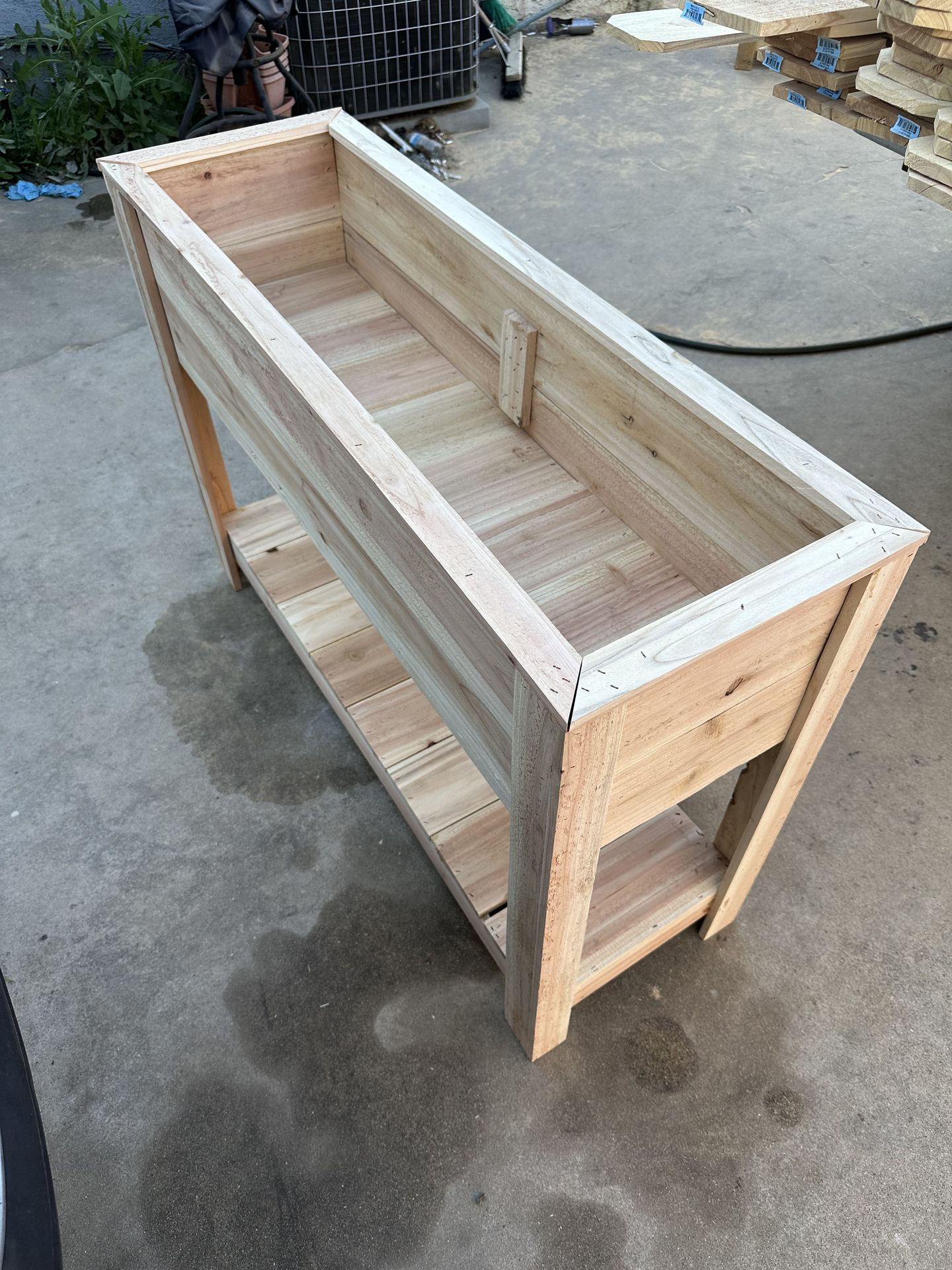32’ Tall standing garden bed 12-3/4” by 45’ Perfect for an outside display for your plants Made out of Cedar wood Can be stained for protection and color($25) Darin holes can be added(Free) My boxes have lasted 3 years outside and are still strong and look good with no stain 1: $100 2: $160 3: $240
