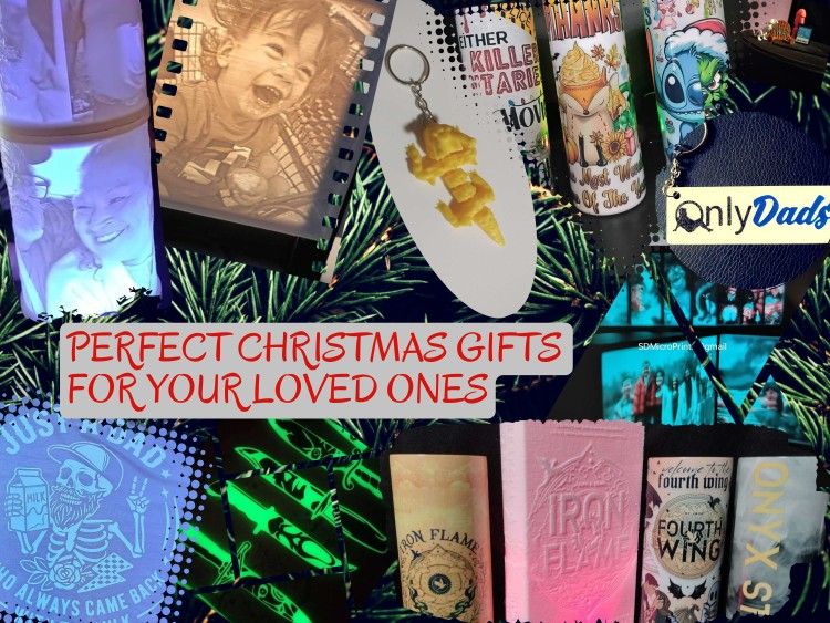 Custom Christmas Gifts perfect for every person on your list. 3D Keychain -$5 3D Bookmark - $5 Personalized photo Bookmarks $10 Personalized photo keychains $10 Print ready 20oz Skinny tumblers $15 Personalized tumbler $25 Permanent vinyl decals Small 5 inches or less $10 Medium 5-11 inches $15 Custom complex orders can be quoted Small led light box $20 Large LED light boxes $35 All of these items will be customized to fit your perfect gift needs. Even for that one person has everything to functional cup with a family portrait or even a keychain for those long haul drivers. Let us help you make this holiday standout.
