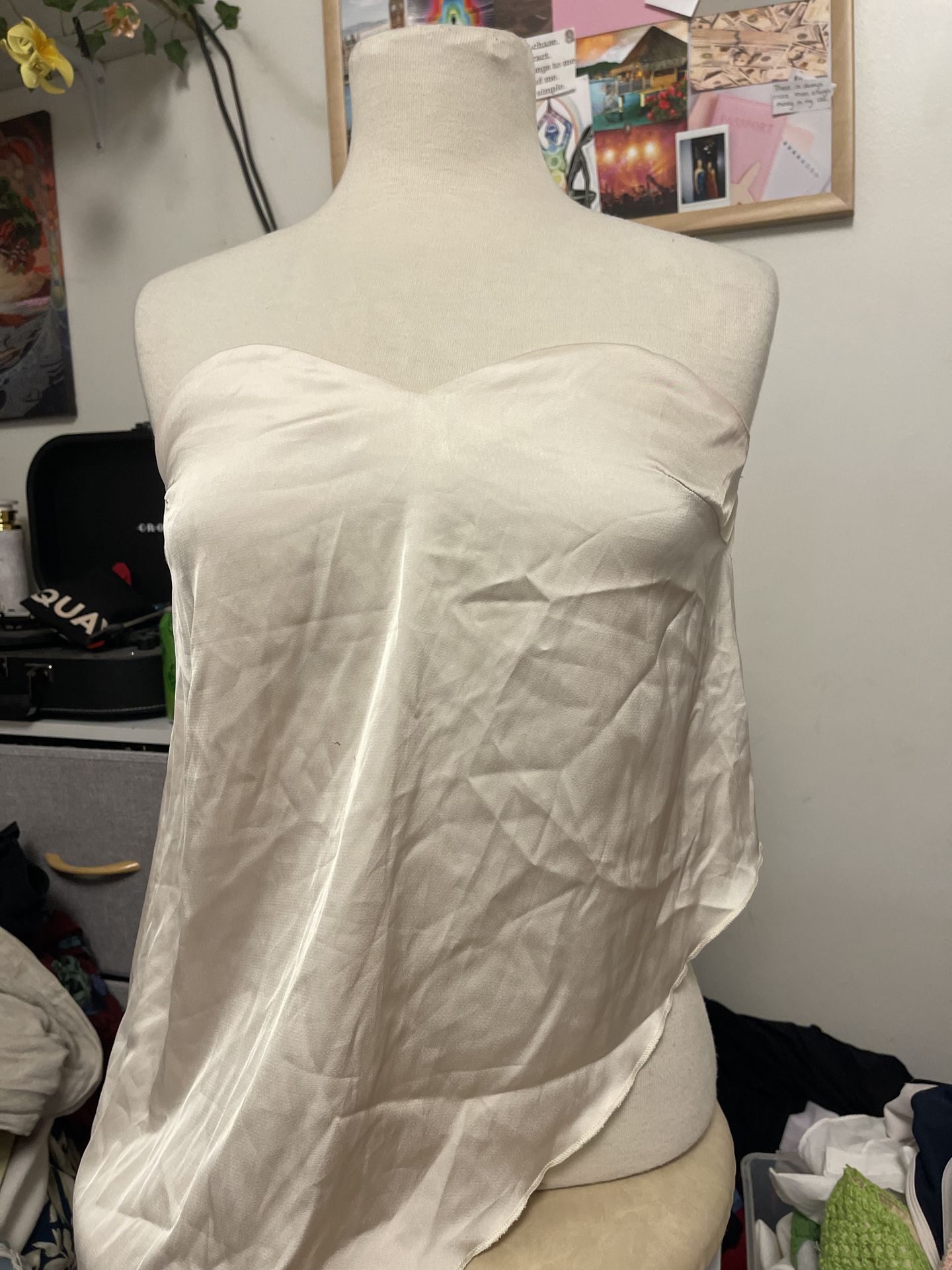 Diagonal cut off the shoulder satin white shirt