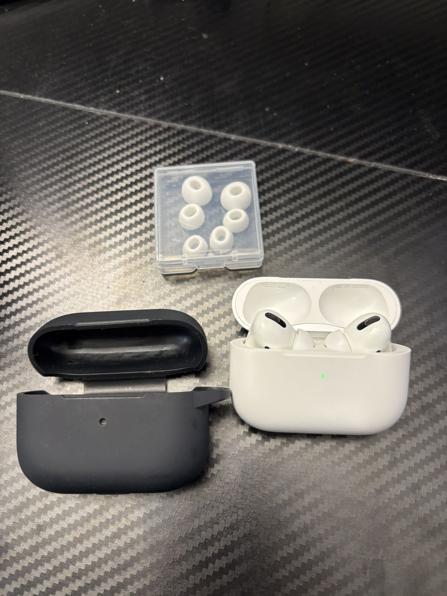 Selling my 1st Generation AirPods Pro. These have been well-cared for and are fully cleaned/sanitized for the next owner. What’s Included: AirPods Pro (1st Gen): Both left and right earbuds. MagSafe/Wireless Charging Case: Holds a great charge. Bonus Silicone Case: Protective black silicone cover. Extra Ear Tips: Includes small, medium, and large silicone tips (the small and large are unused). Charging Cable: Either braided Lightning to USB-A or Lightning to USB-C cables available. Condition: Functionality: 10/10. Active Noise Cancellation and Transparency mode work perfectly. Great audio Battery: Solid health; still gets great playback time on a single charge. Cosmetic: Very clean. Minor surface marks on the case.