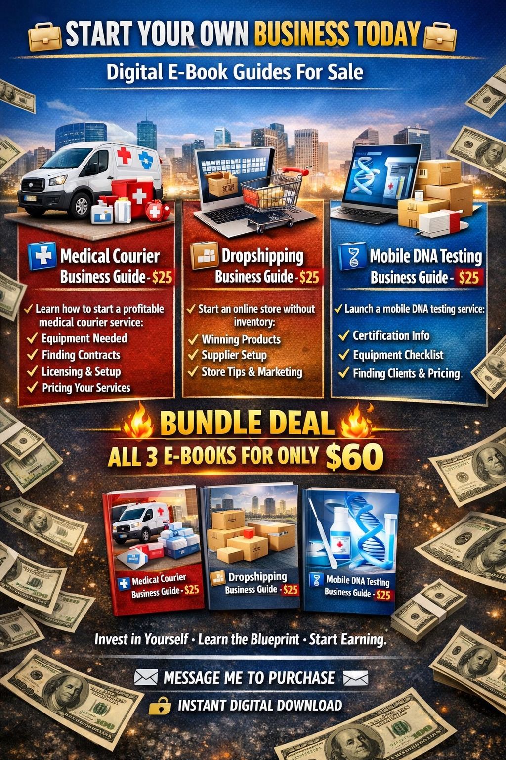 Ready to start a real business but don’t know where to begin? This bundle includes 3 powerful step-by-step guides: 🚑 Medical Courier Business Guide 💻 Dropshipping Blueprint 🧬 Mobile DNA Testing Business Guide 💰 $25 Each or Save By Purchasing Bundle For $60 Inside you’ll learn: ✔️ Business registration steps ✔️ Startup costs breakdown ✔️ Equipment & tools needed ✔️ How to find paying clients ✔️ Pricing strategies ✔️ Scaling tips These are beginner-friendly, easy-to-follow guides designed to help you move from idea to income. Instant digital download. No waiting. No fluff
