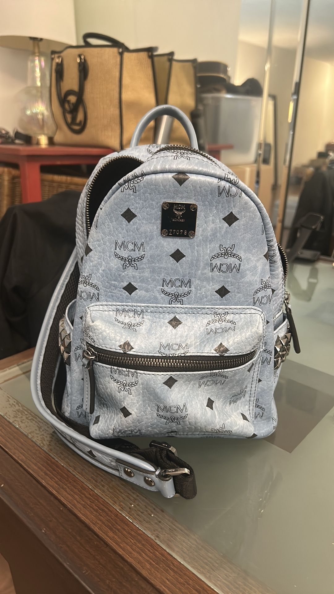 Mcm bistros side stud mini stark backpack.Light blue .slightly used .good condition.bought at mcm Beverly center in La.