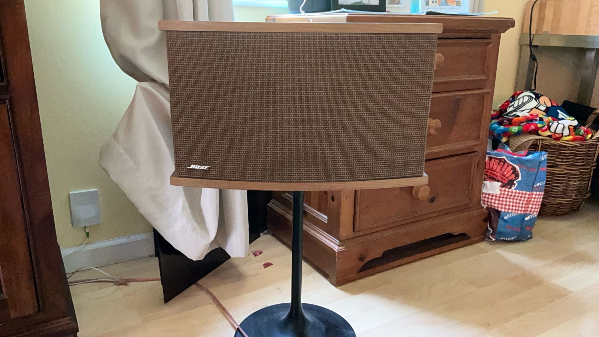 These are Bose’s flagship audio speakers. They are series 6. Each speaker has 9 drivers. There are 8 in back and 1 in front.Wood grained cabinet and grills are in fantastic shape. The Speakers are accompanied by the Bose Active equalizer which fully enhances their incredibly rich sound. The speakers are designed to handle power of 10-450 watts.. Also included are two tulip stands that screw into the bottom of each speaker. For anyone looking to really blast their music in rich clear sound, whether at home, in a media room or even in a large hall, these diverse speakers are for you.