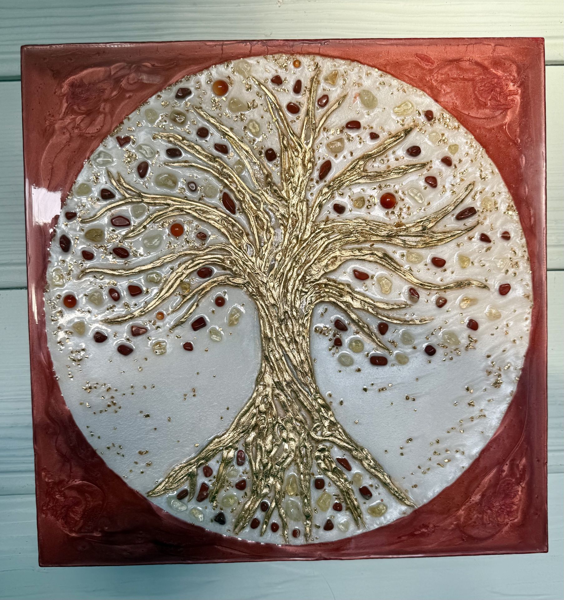 Handmade Citrine and Red Agate Tree Art – 20x20 Wood Panel