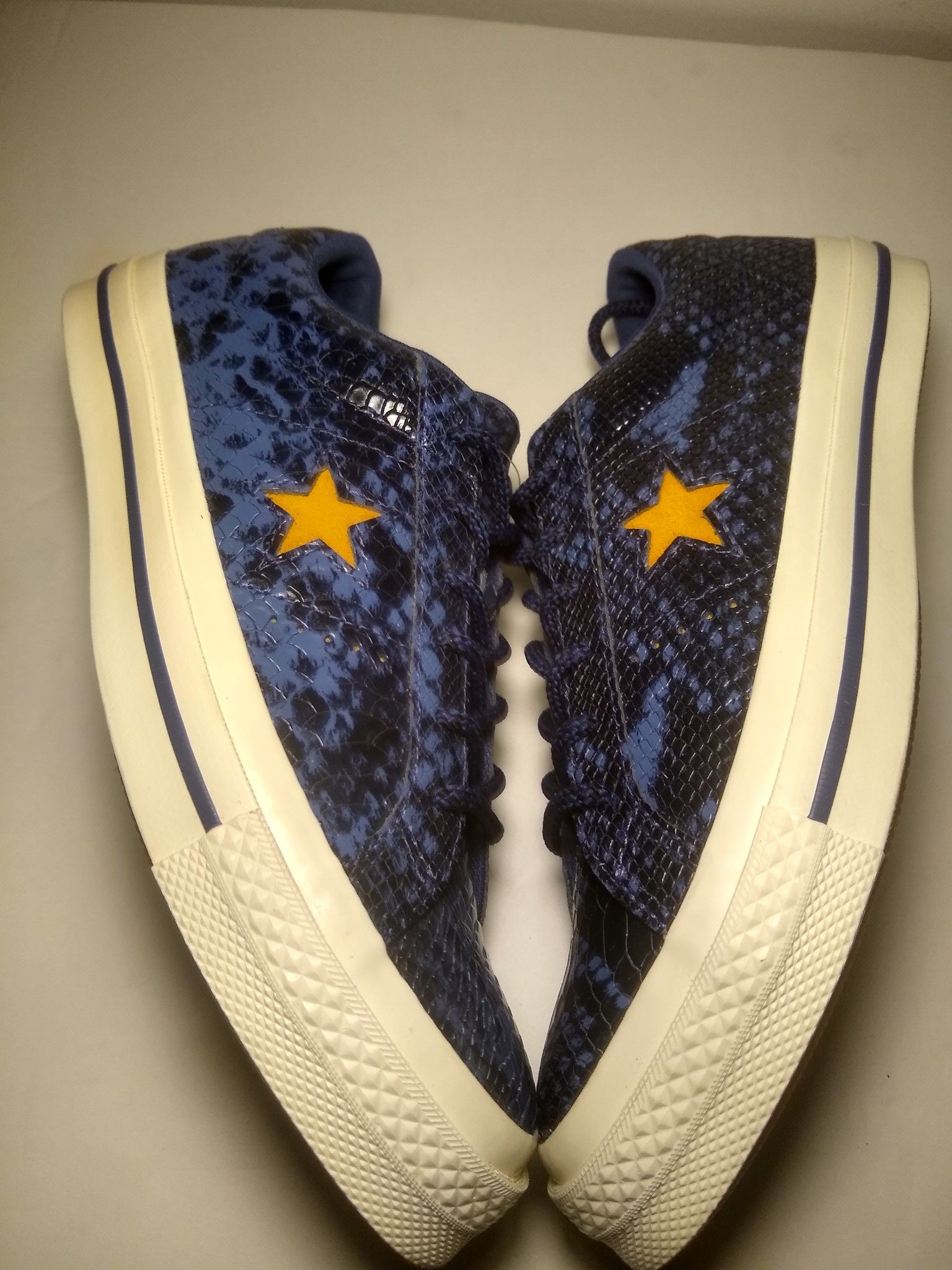 Converse One Star, Navy blue/Black/White, Olympio Snake Leather Natural, size 5 for men 7 for Women, brand new . Hablo Español. SALESMAN'S SAMPLE - The salesman samples are 100% authentic. Samples are usually produced in small quantities to be presented to providers, in order for them to make larger quantities. Some of this shoes were never release to the public, and it makes them very unique.