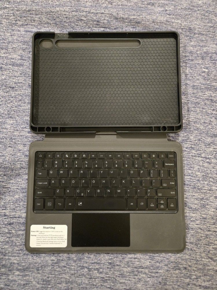 Very lightly used, only fits with galaxy tab S9 /S9 FE. Has kickstand, backlit keyboard, connects via Bluetooth. The keyboard is detachable from the main case.