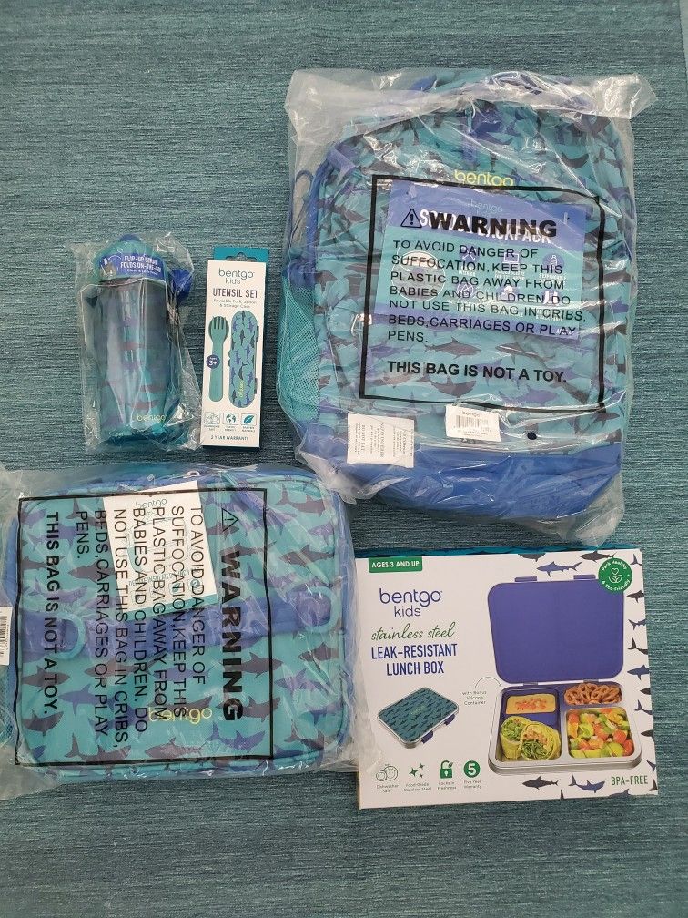 Bundle includes: 1 Bentgo Kids Shark Prints Backpack 1 Bentgo Kids Utensil Set 1 Bentgo Kids Stainless Steel Shark Prints Lunch Box 1 Bentgo Kids Shark Prints Water Bottle 1 Bentgo Kids Shark Prints Lunch Bag Everything is brand new.