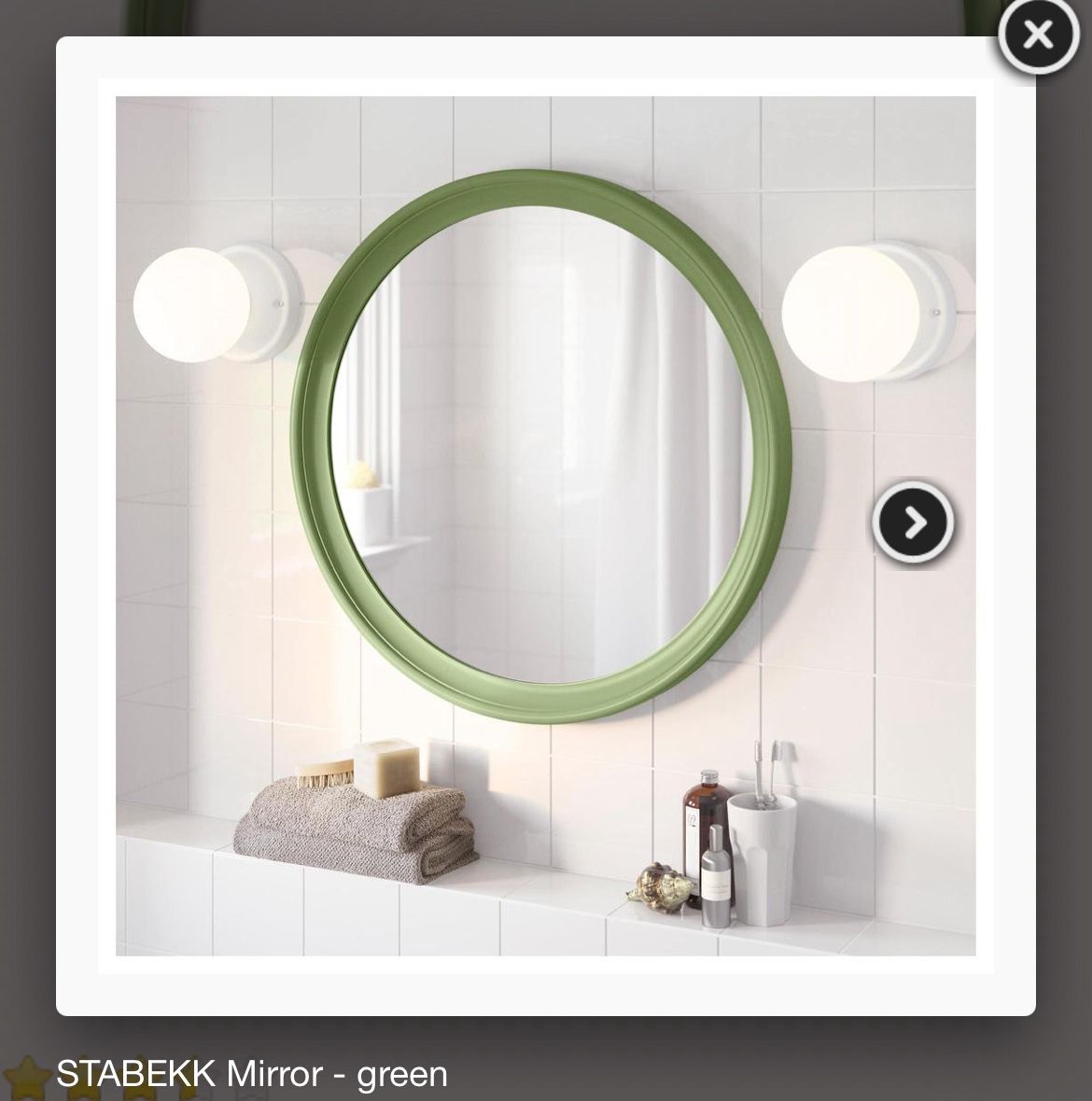 It is a round mirror with a green frame made of solid pine. It is 75 cm in diameter. It has a safety film that reduces damage if the glass breaks. It is suitable for use in high humidity areas, such as bathrooms.