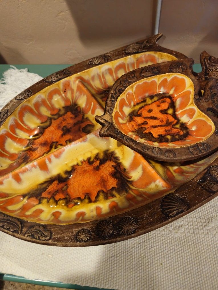 Cool kitschy Midcentury ceramic large fish tray with four separate sections. Faux wood base and fun orange and yellow glazing surface. With matching mini fish tray. Such a cool entertaining serving trays or use to display. 17"x11" Made in USA Small chip on back, not noticeable. Tiki bar decor. Housewares Kitchen Serving Dish Vintage MCM