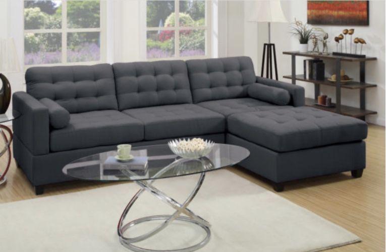 Sectional Sofa Item # F7587 Color: Slate Black Polyfiber Solid pine Plywood Dimensions: Sectional : 110″ x 72″ Reverisble L/R Chaise: 66″ x 36″ x 35″H 2-Seat Sofa: 66″ x 36″ x 35″H Some Assembly Required