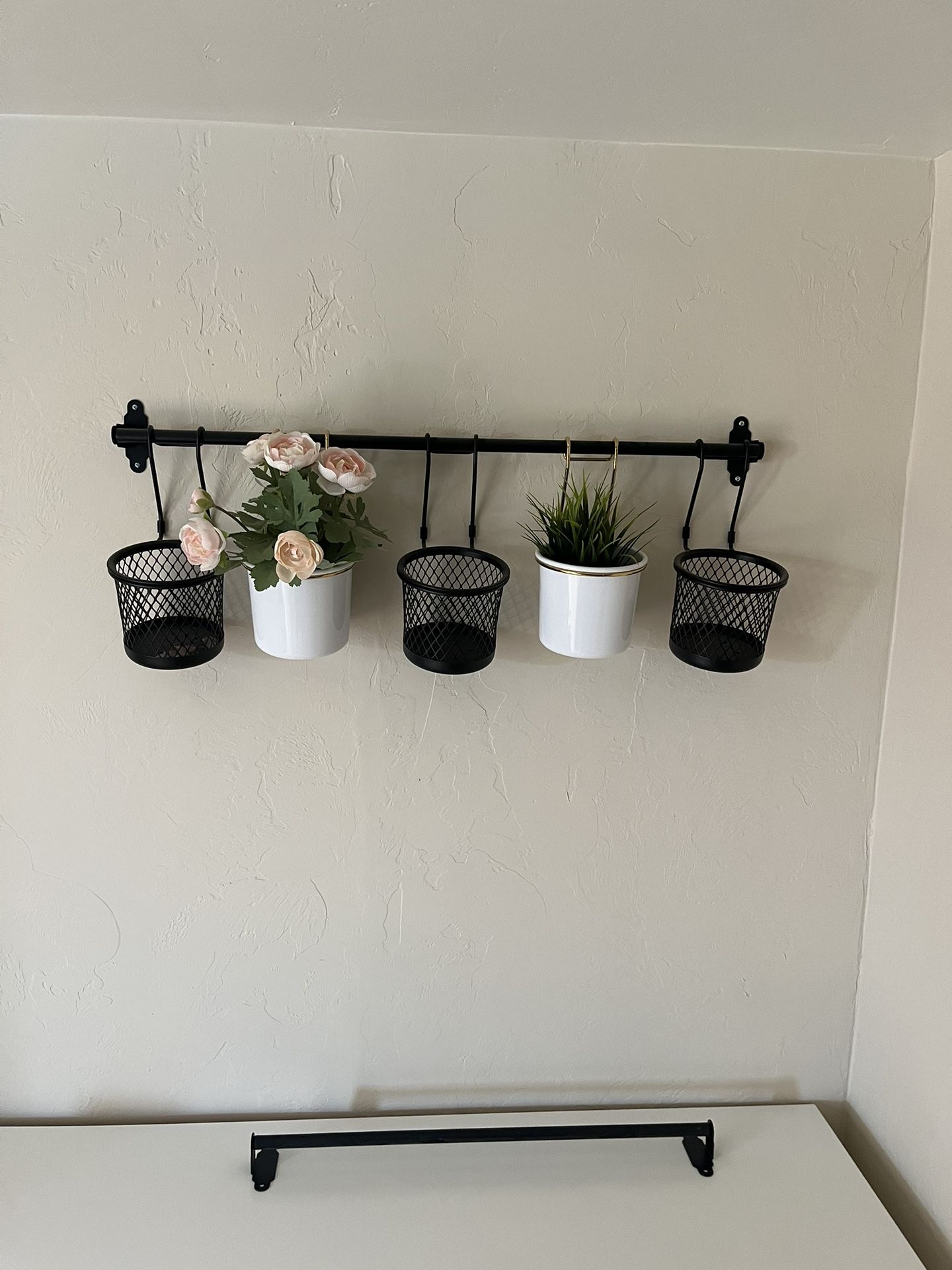 Ikea hanging baskets for accessories or plants. Really cute! Please see images - there is a length included for the shorter and longer bar. Make an offer - $10 more if you want the plants!