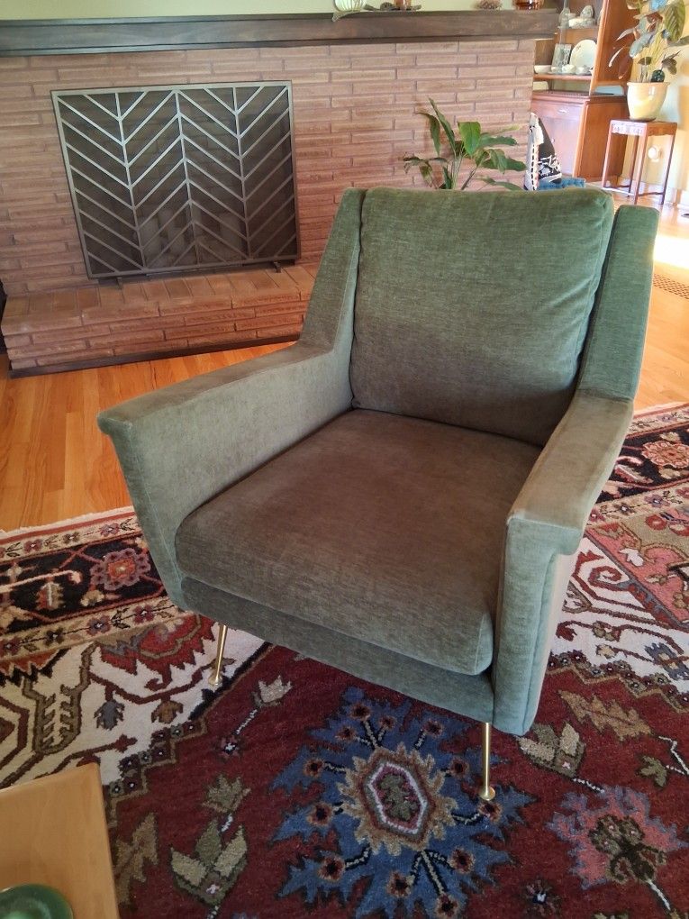 Beautiful and comfortable West Elm Carlo accent arm chair in excellent like new condition. Green (Tarragon) velvet fabric with brass metal legs. Great mid century modern design. Dimensions: 36" deep, 33" tall, 30" wide at the arms and tapering towards the back. We purchased this chair new and it has had one home. It's been in our living room and is rarely used. Sturdy and well constructed, it comes from a clean smoke-free home. Currently available at West Elm in the same color and fabric for $729 (not including the delivery fee) as shown in the screen shot image.