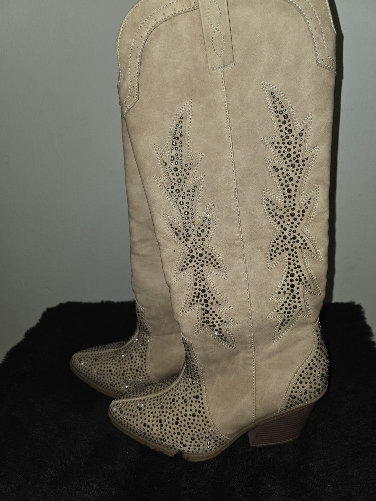 These are Sugar western cowgirl boots in sand multi, featuring a faux leather upper with dazzling rhinestone accents and a block heel. Size 11. Never worn and missing a few rhinestones. $30