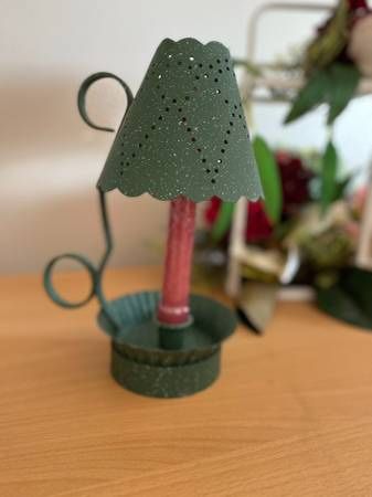 Awesome Vintage hunter green candle holder lamp with handle in a rustic prairie style/boho theme. Green tin with a cute hole punched shade that lets the light through. New taper candle. This was never used. - Home décor decoration colonial primitive farm house farmhouse vtg
