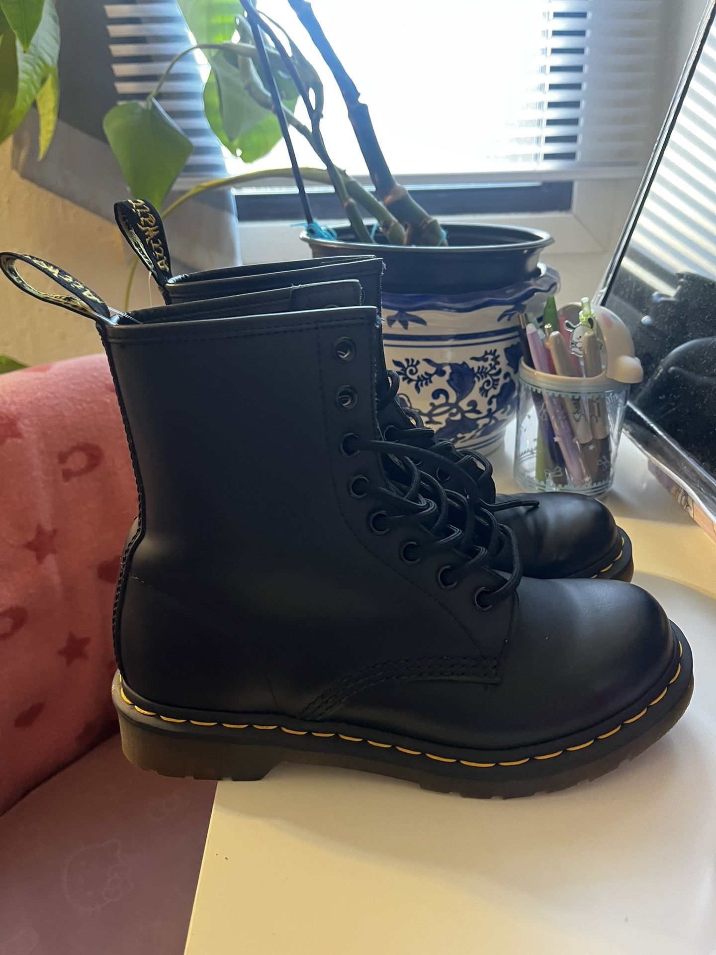 ONLY WORN ONCE, as you can tell by bottom they had very minimal use. In great condition after tax these are about $200. I’m selling them for half the price. 1460 WOMEN'S Smooth Leather Lace Up Boots
