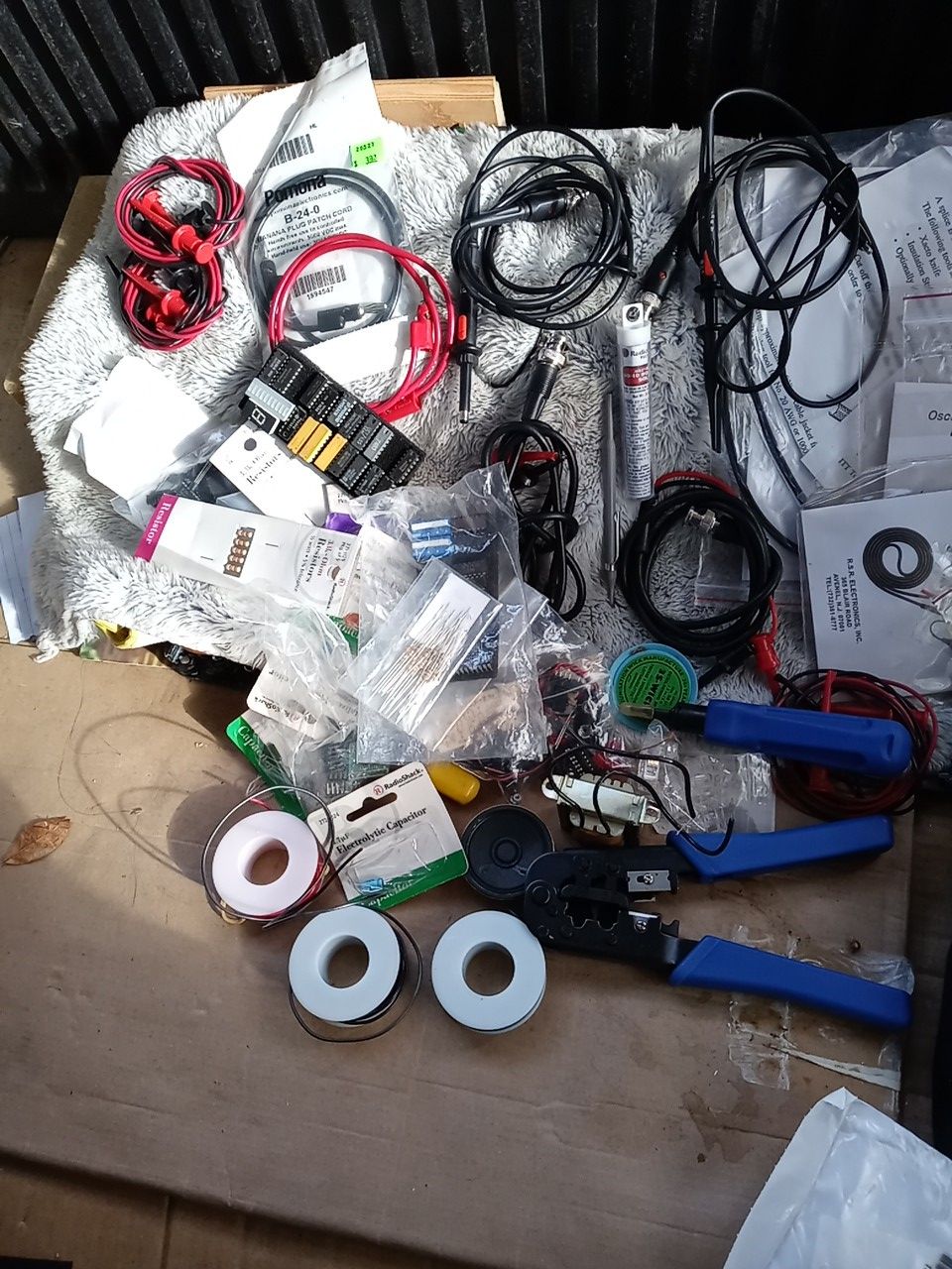 Many new material resistors capacitors etc . tools circuit board amd much more other than pictures. Many more includes box ...Make me a offer and its urs
