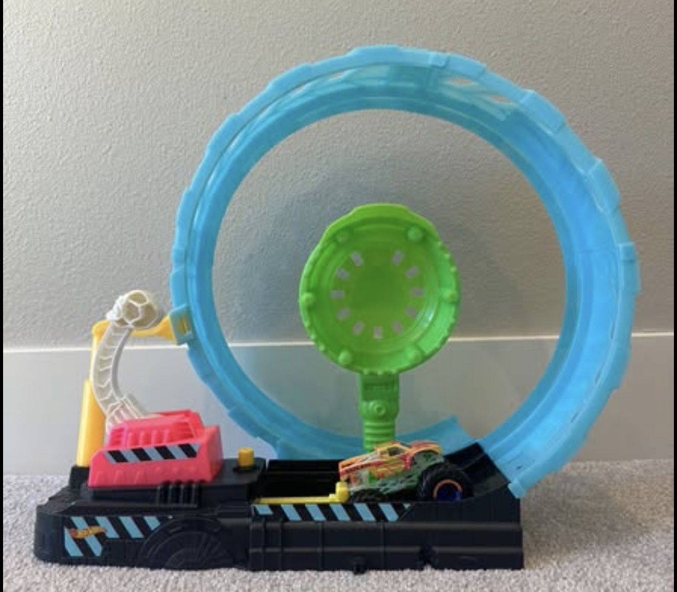 Glow in the dark fun! Includes all original pieces: launcher, trophy cup, giant loop, car, and monster truck. Currently retails for $59. Basically brand new without box!