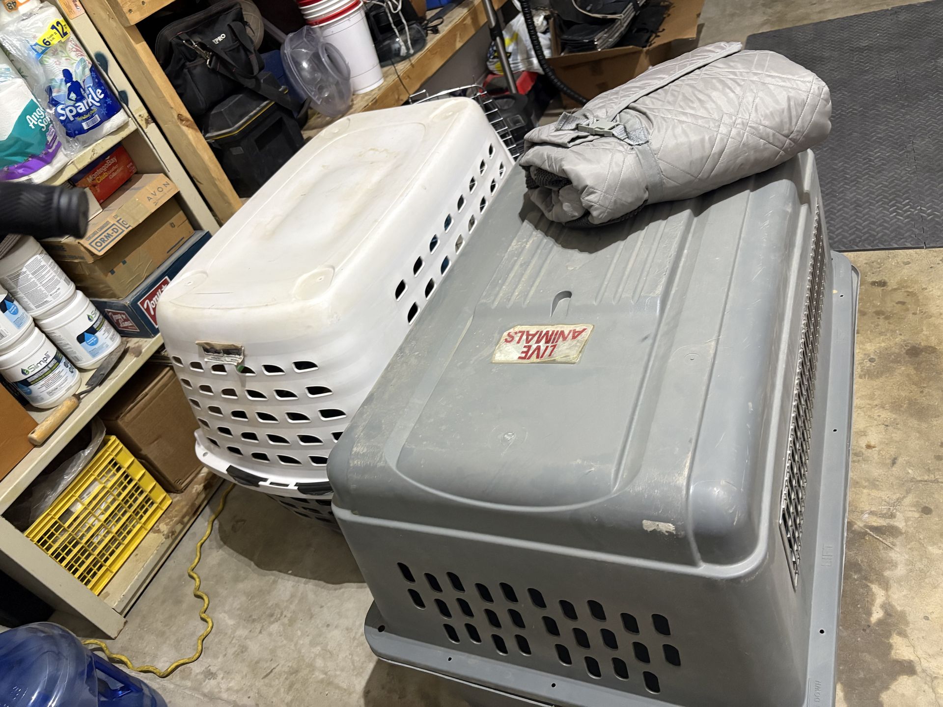 2 kennels for extra large dogs (One has the cover) Includes a tall double feeder $45 each or $90 for both.