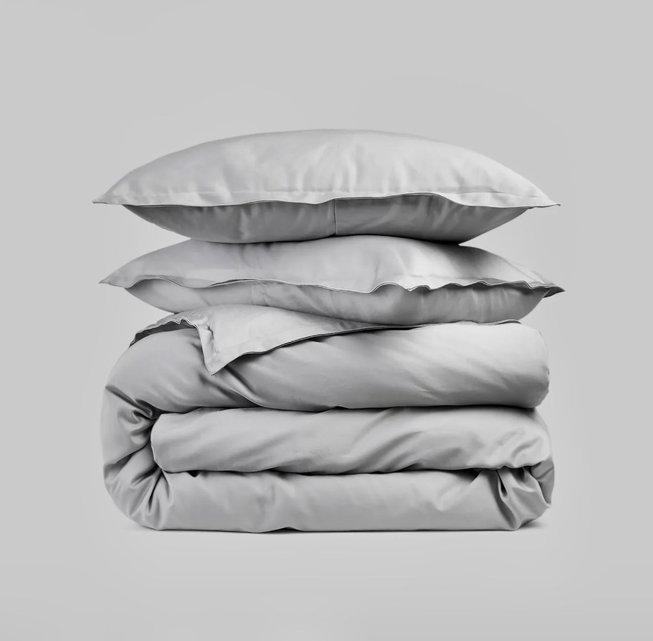 Parachute duvet set king/cal king light grey sateen, includes three Euro Shams. I used it for two months and decided to go with a different color. Like new, perfect condition. Great deal .
