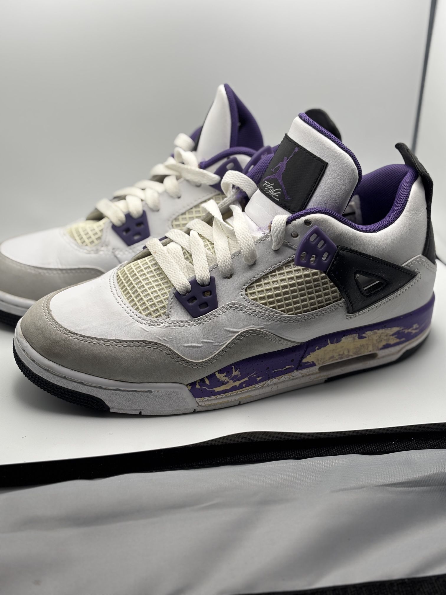 Size 6.5Y / 8 Women These have only been worn a handful of times. Only issue is the paint on the midsole is heavily peeling. A vibrant take on Michal Jordan’s fourth signature shoe—this girls’ edition of the Air Jordan 4 sneaker receives a regal update for February 2012. Styled specifically for kids, it features the same specs as the adult version—from a White mesh upper and Neutral Grey leather mudguard to Black leather winged supports at the ankle. Complementing the sleek aesthetic are Ultraviolet Jumpman logos at the tongue and heel. Underfoot, a triple-toned rubber outsole rounds out the design.