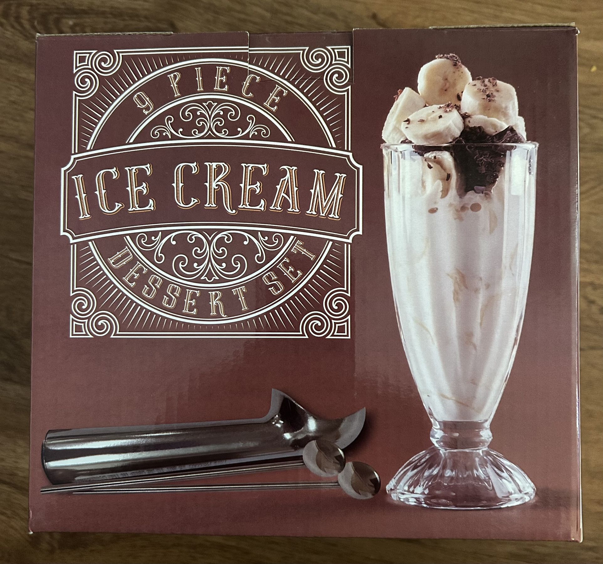 Ice Cream Dessert Set. Includes 4 Durable Glasses, 4 Stainless Straw / Spoons and an Aluminum Scoop. The scoop can be placed in warm water to make scooping the ice cream much easier. The glasses look like old fashion fountain glasses. Pickup in The Colony 75056 Cash Only