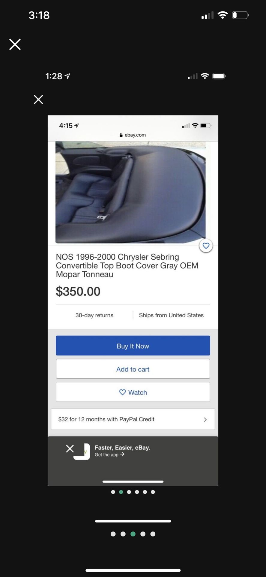 Like new convertible boot top cover for a Chrysler Sebring .. grade A condition. I no longer have my Sebring but kept this because I know many people don’t have and are looking for this part and it’s virtually impossible to find anywhere especially in this good of shape. They go for 300-350 and up if you can locate them online … need to sell asap! 100 obo