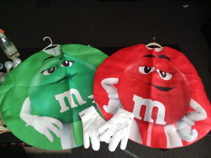 Red and Green matching M&M costumes. Only one pair of white gloves. One size fits all. Price is to sell all together. Folded so kinda wrinkled