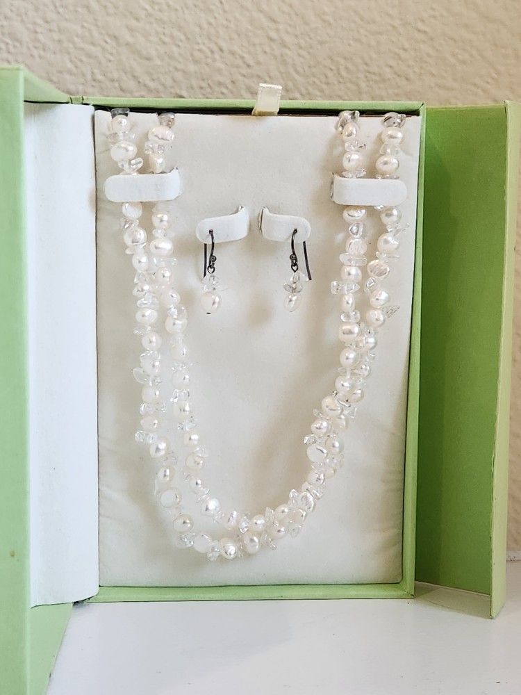 Coldwater Creek Cultured Freshwater Pearl Necklace Set. Necklace (1) and Earrings. Some wear on box. Model: White Gem of a Pearl Set.