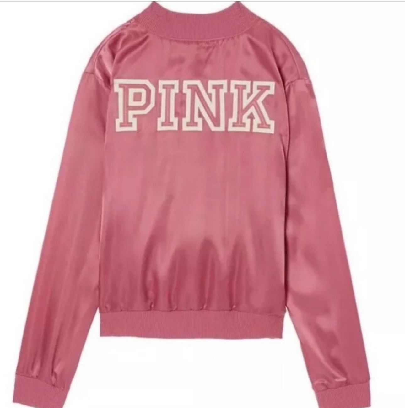 Brand: Victoria's Secret PINK Style: Satin Snap Up Bomber Jacket Color: Soft Begonia (Pink/White) Condition: In excellent pre-owned condition. Has some light stains on the left sleeve, barely noticeable (last picture). See all pictures for details and measurements. Size: Medium -Lightweight -Two front side pockets -Snap closure button up jacket -"PINK" spellout in large embroidered letters on the back -Mini black and white embroidered PINK signature dog/puppy on the front left chest area -No longer in stores, from October 2016 $100