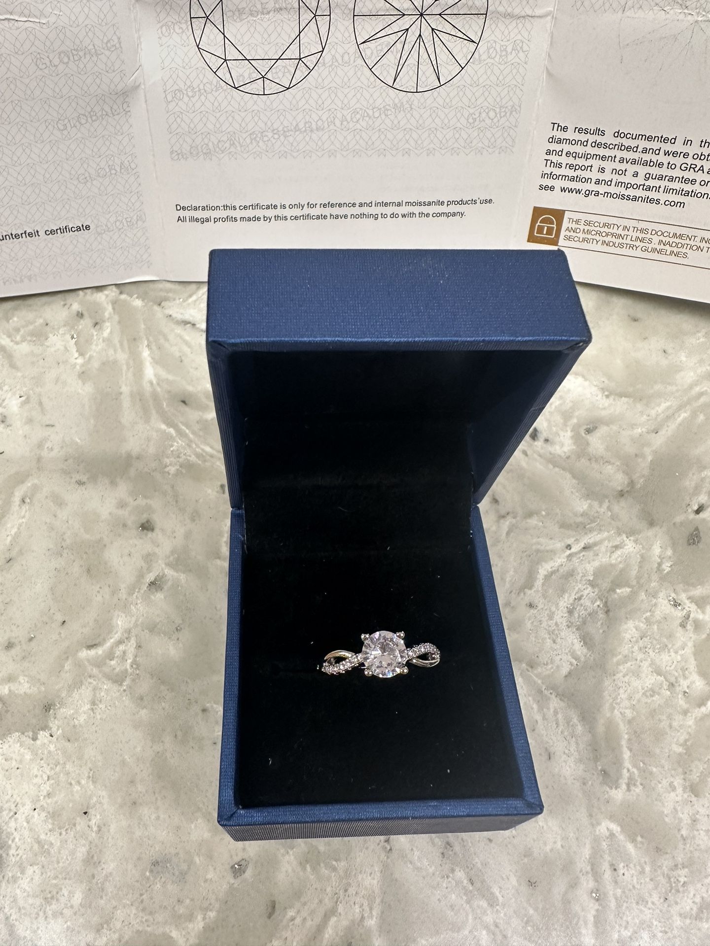 Shape and cutting style: Round Brilliant Carat weight: 1.0 carat Size 6.5 All the paperwork says the rest ◡̈ My fiancé got this beautiful ring for $300, but unfortunately, it didn't fit. We'd love to sell it at a discount to contribute to our honeymoon or make someone's special day even brighter! I’m