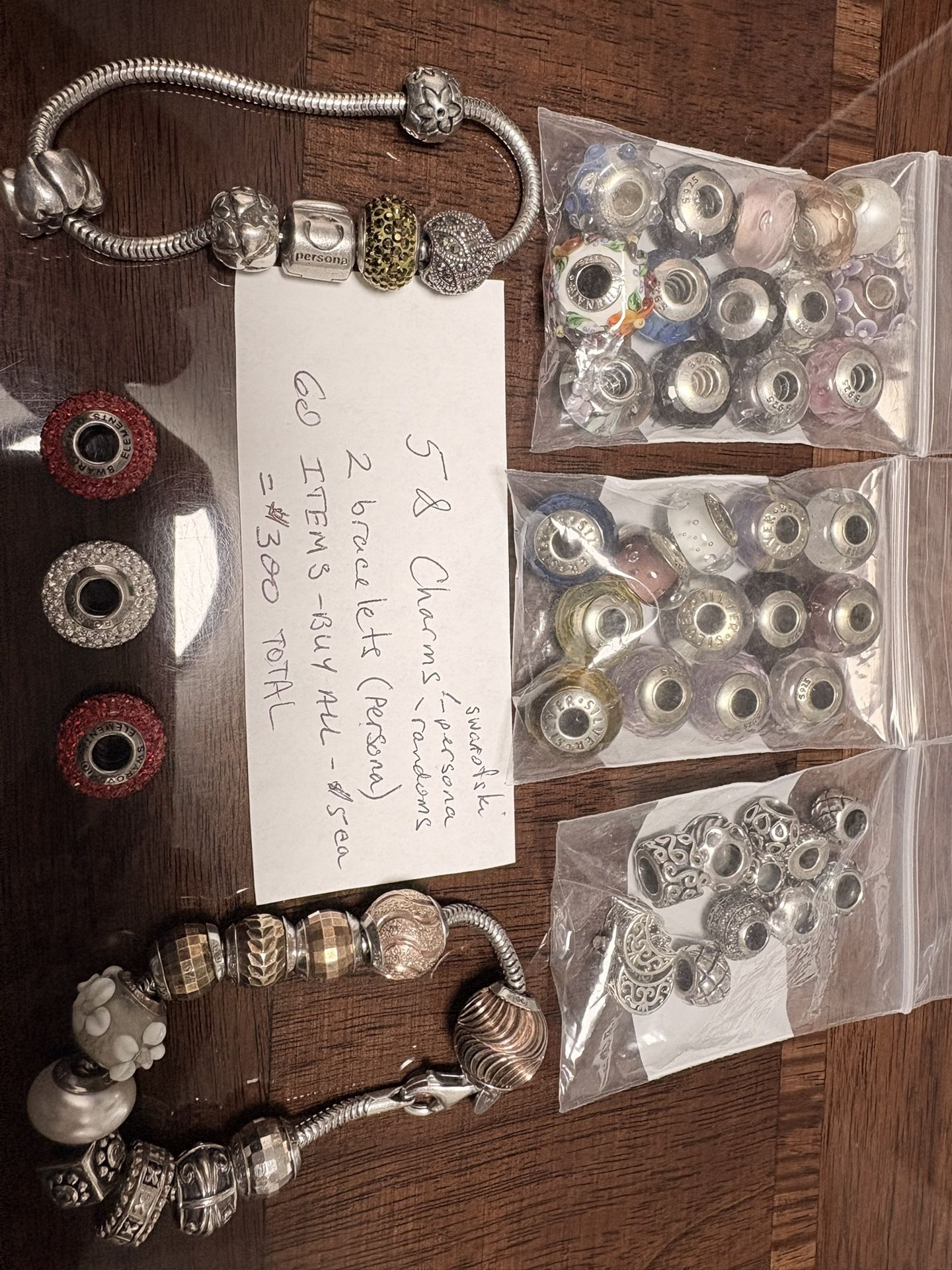 It’s on any bracelet similar to Pandora Many are Italian Designer persona, three Swarovski, and many others 60 items in total, selling as a bulk for five dollars each= $300 firm