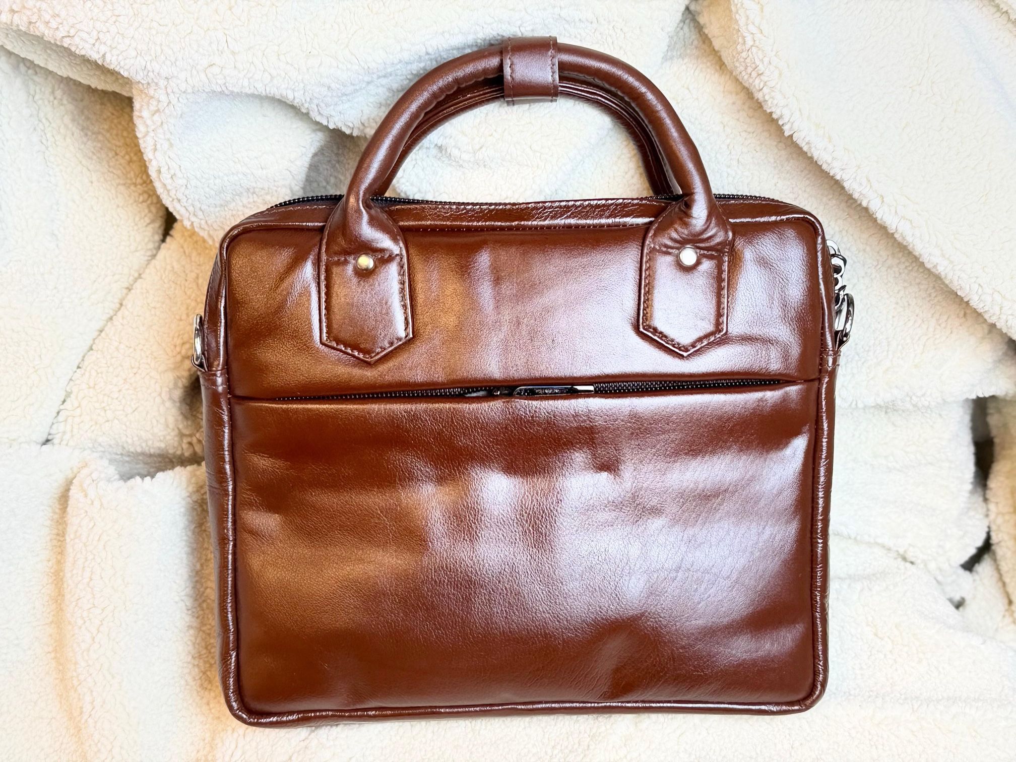 Premium Brown Smooth Finish Genuine Leather Medium Messenger Bag Compact Hand Carry Crafted from 100% genuine leather, this premium brown messenger bag features a smooth, polished finish with a rich natural sheen that highlights the leather’s quality and character. The compact size makes it ideal for everyday essentials while maintaining a refined, professional look. Designed with a structured silhouette, reinforced leather handles, and durable metal zippers, this bag delivers both style and function. The interior is neatly organized with a secure zip compartment and clean lining, perfect for carrying small items,